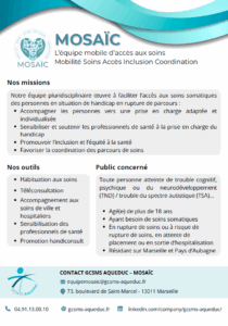 L’équipe mobile d’accès aux soins MOSAÏC a pour mission de faciliter l’accès aux soins pour les personnes en situation de handicap en rupture de parcours de soins.